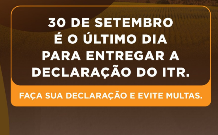 O prazo para entrega da declaração do Imposto Territorial Rural (ITR) referente ao exercício 2021 termina dia 30 de setembro, quinta-feira. O procedimento é obrigatório para pessoas físicas e/ou jurídicas proprietárias, titulares do domínio útil ou possuidoras de qualquer título de imóvel rural, inclusive a usufrutuária.